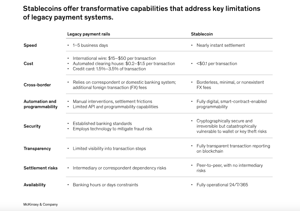 According to EY’s survey of over 250 financial services companies, reducing costs on cross-border transactions with partners and suppliers is the top priority. McKinsey & Company reports that stablecoin transactions can offer near-instant settlement, which has major implications for corporate treasury and global payments.