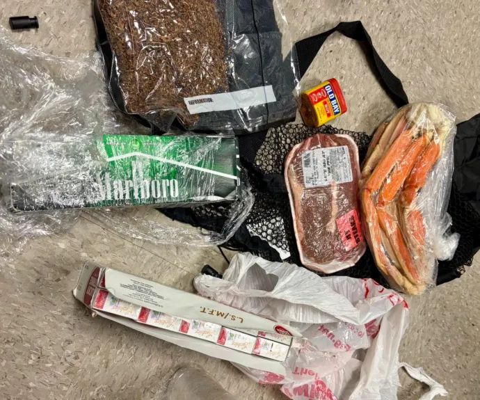 The contraband care package appeared to include a carton of Lucky Strikes and Marlboro menthol cigarettes, a bag of rolling tobacco, a sealed package of beef, and crab legs. A plastic Piggly Wiggly shopping bag and liquid container were also pictured.