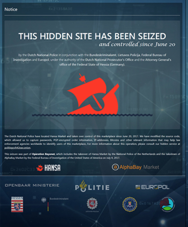On July 20, 2017, after more than a month of covert operation, Dutch police finally shut down Hansa. The site was replaced with an official seizure notice informing users that law enforcement had taken control; the notice also provided links to information on the investigation.
