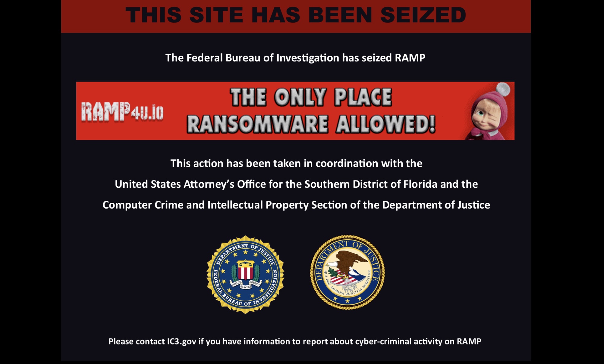 A banner displayed on the seized sites read, “The Federal Bureau of Investigation has seized RAMP,” alongside the seals of the FBI and the US Department of Justice. The notice said the action was carried out in coordination with the US Attorney’s Office for the Southern District of Florida and the DOJ’s Computer Crime and Intellectual Property Section. The banner also featured RAMP’s former slogan, underscoring the forum’s explicit embrace of ransomware activity.