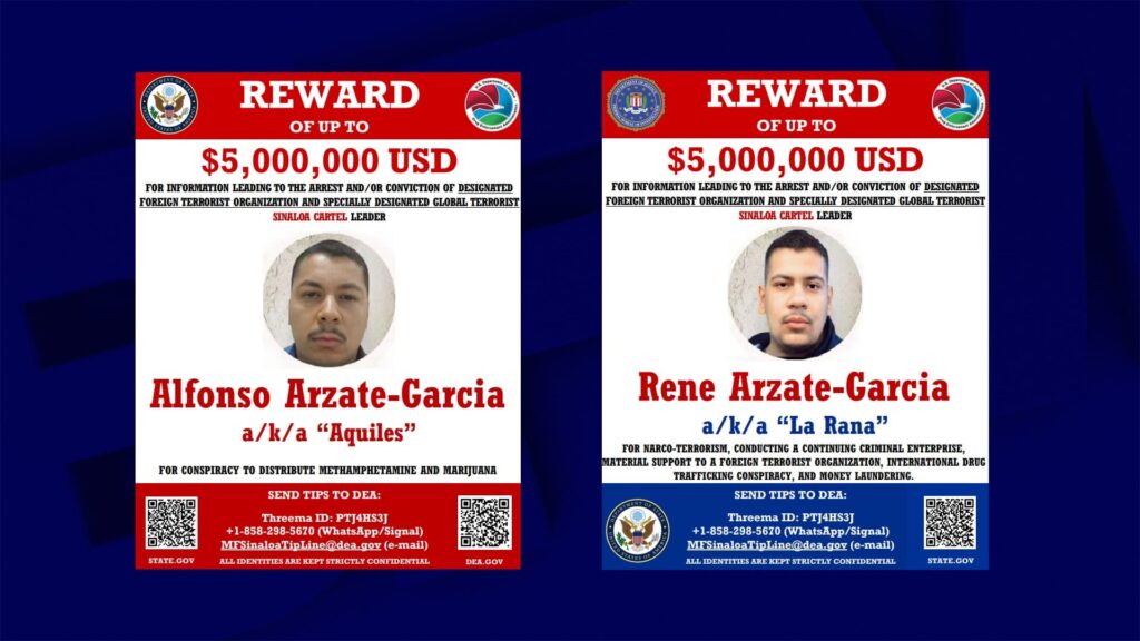In coordination with the Drug Enforcement Administration, Federal Bureau of Investigation and other U.S. agencies, the U.S. Department of State has offered up to $5 million each for information leading to the arrest or conviction of René and Alfonso Arzate-García, who remain fugitives.