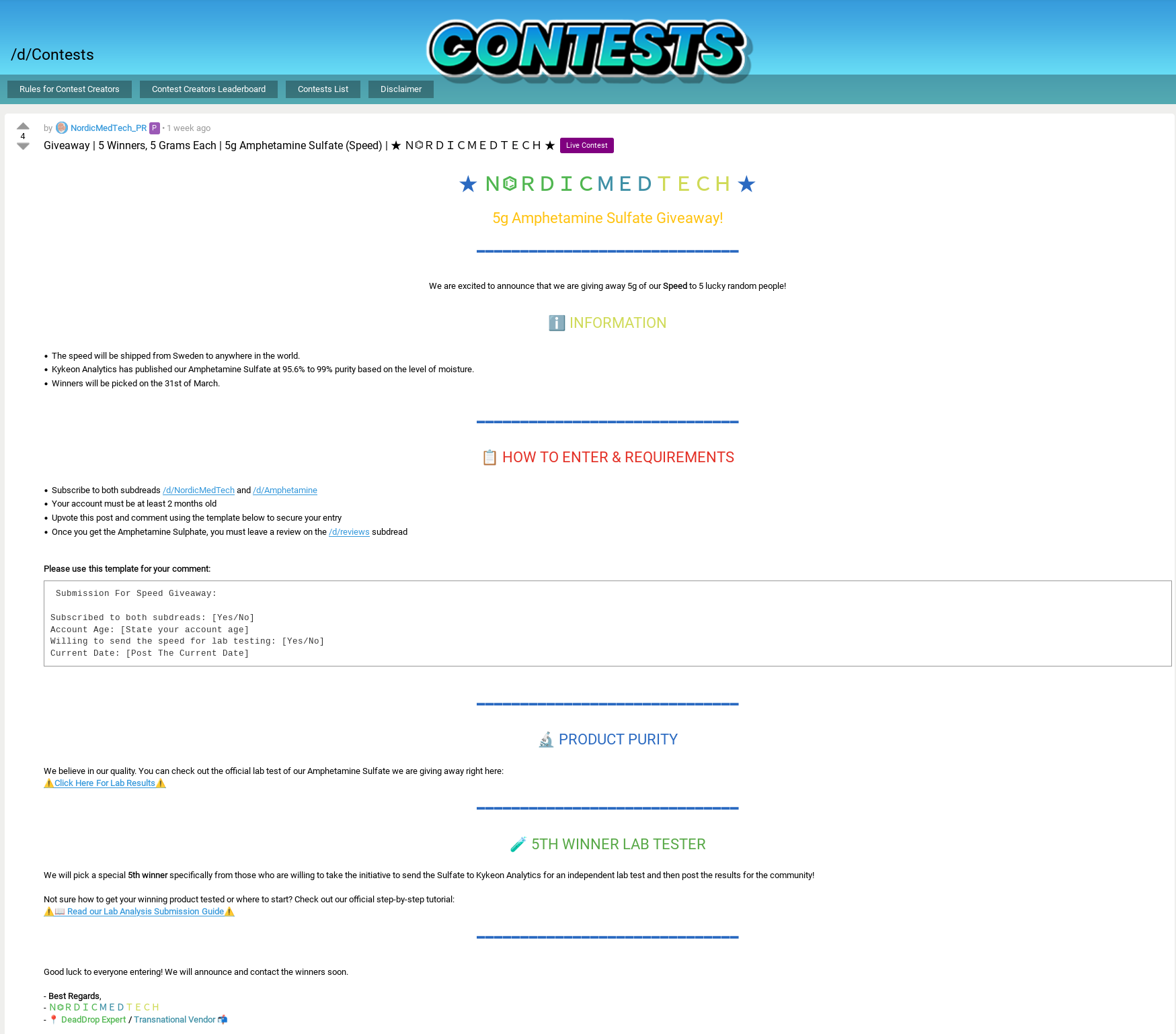 They believe in their quality. You can check out the official lab test of the Amphetamine Sulfate they are giving away right here: Lab Results
