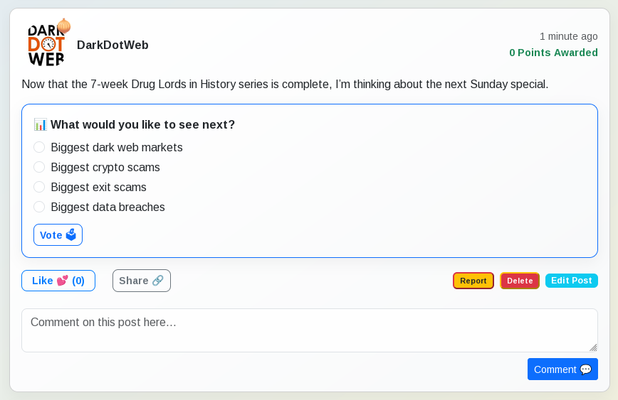 The 7-week Drug Lords series is complete! Vote now to decide the next deep-dive series: Dark Web Markets, Crypto Scams, Exit Scams, or Data Breaches.